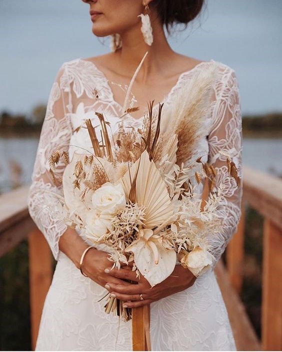 Bó hoa mang phong cách bohemian phóng khoáng tự do, được phối hoàn toàn bởi các loài trắng khác nhau, điểm thêm một vài nhành lau.