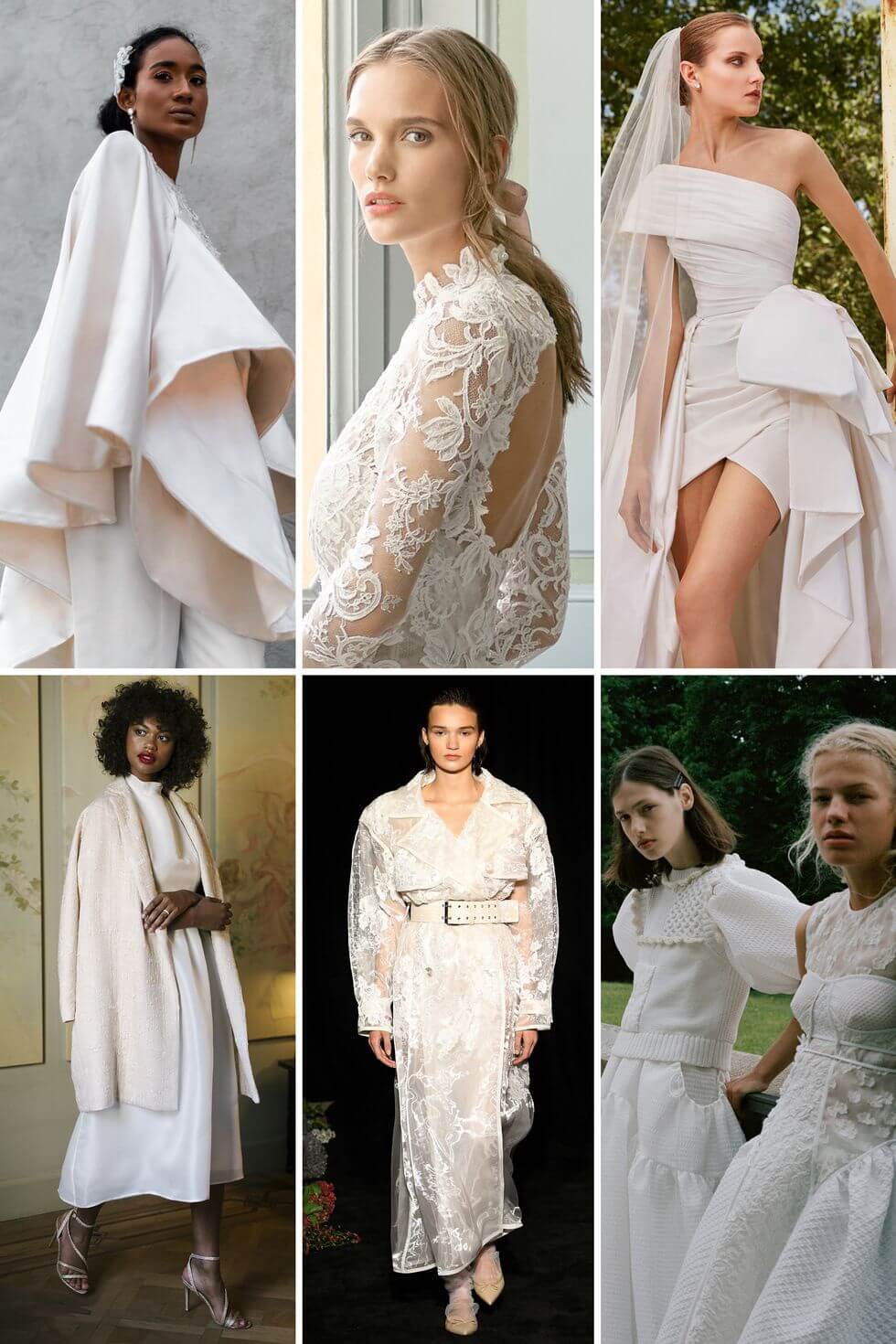 Từ trái qua: Andre Iyamah Bridal Fall 2020; Monique Lhuillier Bridal Fall 2020; Elie Saab Bridal Spring 2021; Valentin Avoh Bridal Fall 2020; Danielle Frankel Bridal Fall 2020; Cecilie Bahnsen mùa xuân năm 2021.