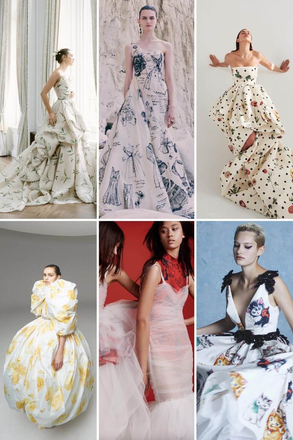 Từ trái qua: Carolina Herrera Spring 2021; Christopher John Rogers Mùa xuân năm 2021; Vera Wang mùa thu năm 2021; Khaite Spring 2021; Danielle Frankel Fall 2020, Valentino Fall 2020 Haute Couture.