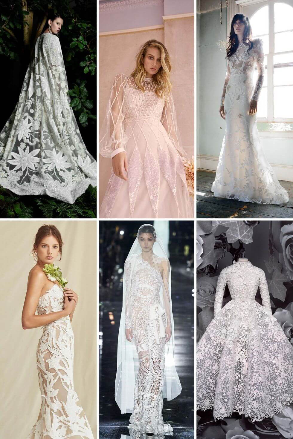 Từ trái qua: Naeem Khan Bridal Fall 2021; Temperley London Bridal mùa thu năm 2021; Elizabeth Fillmore Bridal Fall 2021; Oscar de la Renta Bridal mùa xuân năm 2021; Tom Ford mùa thu 2020; Christian Dior thời trang cao cấp mùa thu 2020.